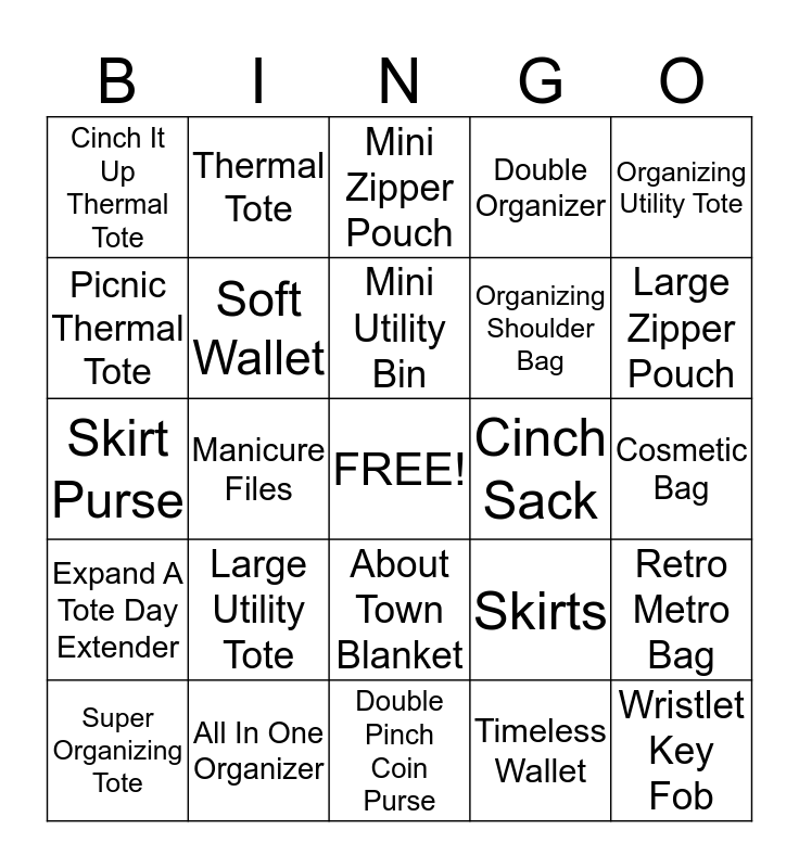 This bingo card has a free space and 24 words: Large Utility Tote, All In One Organizer, Mini Utility Bin, Super Organizing Tote, Organizing Utility Tote, Cinch It Up Thermal Tote, Picnic Thermal Tote, Thermal Tote, Cinch Sack, About Town Blanket, Organizing Shoulder Bag, Skirt Purse, Skirts, Retro Metro Bag, Soft Wallet, Timeless Wallet, Cosmetic Bag, Mini Zipper Pouch, Large Zipper Pouch, Manicure Files, Wristlet Key Fob, Expand A Tote Day Extender, Double Organizer and Double Pinch Coin Purse.