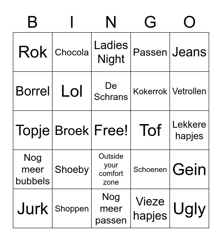 This bingo card has a free space and 24 words: Shoeby, Shoppen, De Schrans, Jurk, Jeans, Rok, Borrel, Chocola, Tof, Outside your comfort zone, Kokerrok, Topje, Schoenen, Gein, Lol, Vieze hapjes, Lekkere hapjes, Ladies Night, Vetrollen, Broek, Ugly, Nog meer bubbels, Passen and Nog meer passen.