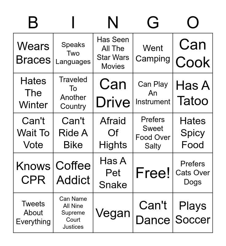 This bingo card has 25 words: Coffee Addict, Vegan, Can Drive, Tweets About Everything, Can Cook, Wears Braces, Hates The Winter, Speaks Two Languages, Prefers Sweet Food Over Salty, Has A Pet Snake, Can Play An Instrument, Can't Wait To Vote, Free!, Prefers Cats Over Dogs, Traveled To Another Country, Plays Soccer, Hates Spicy Food, Has Seen All The Star Wars Movies, Has A Tatoo, Can't Ride A Bike, Afraid Of Hights, Can Name All Nine Supreme Court Justices, Knows CPR, Went Camping and Can't Dance.