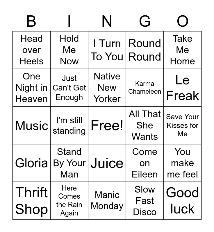 This bingo card has a free space and 110 words: Take Your Mama, What is Love?, All That She Wants, Parklife, Who Do You Think You Are, Mmm bop, It’s like that, 1999, Faith, Get Lucky, Superstition, I'm Coming Out, Vogue, Like a Prayer, Hung up, Papa Don’t Preach, Music, Ray of Light, Justify my love, I will survive, You make me feel, Ring my bell, Boogie Wonderland, Upside Down, I love to love, Native New Yorker, Take Me Home, Dancing Queen, I feel love, We are family, Le Freak, Round Round, I Turn To You, Spinning Around, Pure Shores, Good luck, Independent Women Part 1, Grace Kelly, Here Comes the Rain Again, Atomic, Don't you want me, Tainted Love, Karma Chameleon, I'm still standing, Come on Eileen, Running up that hill, Take on Me, I wanna dance with somebody, Girls Just Wanna Have Fun, Holding Out for a Hero, Bulletproof, Ooh la la, Slow Fast Disco, Magic Position, We are your friends, Call Me, Hyperballad, Can’t get blue Monday out of my head, Acceptable in the 80s, Just Can't Get Enough, Head over Heels, Planet Earth, Tennessee Mountain Home, Man I Feel Like A Woman, The Devil Went Down to Georgia, Stand By Your Man, Rose Garden, Crazy, Dallas, Rise Like A Phoenix, Waterloo, Love Shine a Light, Hold Me Now, Making Your Mind Up, Flying the Flag (For You), Ooh Aah…Just A Little Bit, Better the Devil You Know, Save Your Kisses for Me, Boom Bang a Bang, Puppet on a String, Say it Again, Everybody Dance Now, Pump up the Jam, Children, The Key, The Secret, We Like to Party, No Limit, The Power, Everybody's Free, Groove Is In The Heart, Show Me Love, One Night in Heaven, Rhythm is a Dancer, Gloria, Daniel, Wuthering Heights, You're History, I think we're alone now, It's a Sin, Manic Monday, Train, Heavy Cross, Boys Don't Cry, Thrift Shop, Juice, Fashion, Cha Cha Heels, Love to Love You Baby, Young Hearts Run Free and Funky Town.