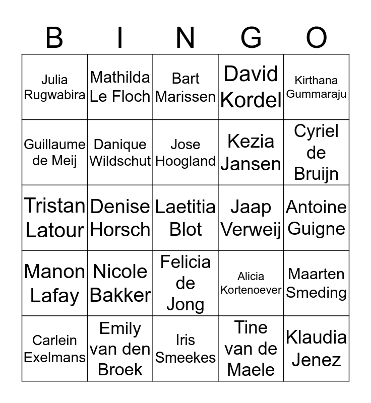 This bingo card has a free space and 24 words: Nicole Bakker, Emily van den Broek, Jose Hoogland, Carlein Exelmans, Kirthana Gummaraju, Julia Rugwabira, Guillaume de Meij, Mathilda Le Floch, Jaap Verweij, Felicia de Jong, Kezia Jansen, Tristan Latour, Alicia Kortenoever, Maarten Smeding, Danique Wildschut, Tine van de Maele, Antoine Guigne, Bart Marissen, Cyriel de Bruijn, Denise Horsch, Klaudia Jenez, Manon Lafay, David Kordel and Iris Smeekes.