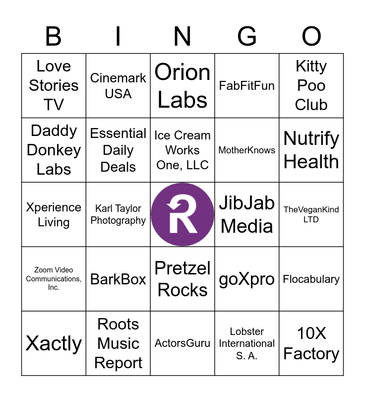 This bingo card has a free space and 50 words: 1st Phorm, 10X Factory, ACT Online Training, ActorsGuru, BarkBox, Black Bear Composting, Cinemark USA, CloudShark, Daddy Donkey Labs, Elite Inc, Essential Daily Deals, FabFitFun, Flocabulary, goXpro, Greenhouse, I LOVE MY WIFI, Ice Cream Works One, LLC, JibJab Media, Jungle Gym Apps, Kitty Poo Club, Karl Taylor Photography, Lobster International S. A., Love Stories TV, MotherKnows, MyLawnQuote, NBC Universal Media, Nutrify Health, Ownable, Orion Labs, Pretzel Rocks, Phi Kappa Psi, Quick Easy Quote, Quizlet Inc, Racing TV, Roots Music Report, Rubber Chicken Cards, Search Geeks, Sock Panda, The Beard Club, TheVeganKind LTD, Universal Quoting, Upfluence, Webshots, WineDirect, Xactly, Xperience Living, YouNeedABudget.com, YetiVisit SA, Zoom Video Communications, Inc. and Zubie.