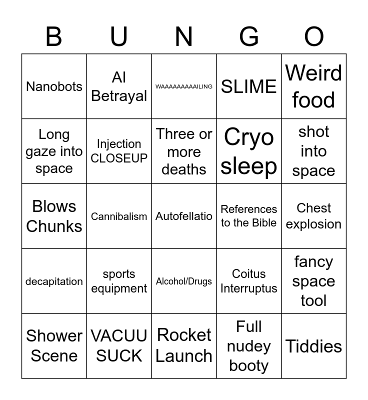 This bingo card has a free space and 31 words: Rocket Launch, Someone gets SHANKED, Cannibalism, Self-healing, Nanobots, WAAAAAAAAAILING, Injection CLOSEUP, Coitus Interruptus, References to the Bible, Full nudey booty, Chest explosion, Tiddies, Body punched through, self-destruct sequence, shot into space, tongue removal, fancy space tool, sports equipment, decapitation, Alcohol/Drugs, Weird food, Alien Encounter, Shower Scene, AI Betrayal, Cryo sleep, Long gaze into space, SLIME, Blows Chunks, VACUU SUCK, Three or more deaths and DOCKING.