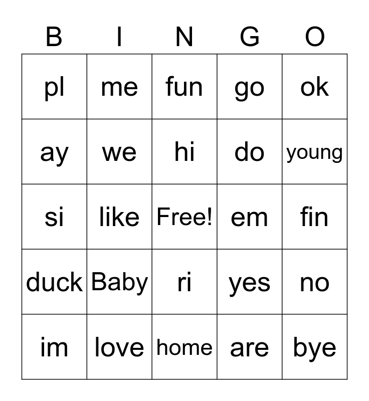 This bingo card has a free space and 24 words: Baby, love, hi, im, ok, pl, ay, me, em, ri, do, si, yes, no, we, are, fin, fun, young, like, bye, duck, go and home.