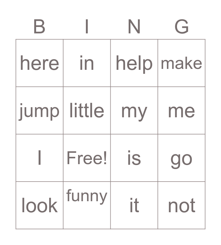 This bingo card has 16 words: funny, go, help, here, I, in, is, it, jump, little, look, make, Free!, me, my and not.