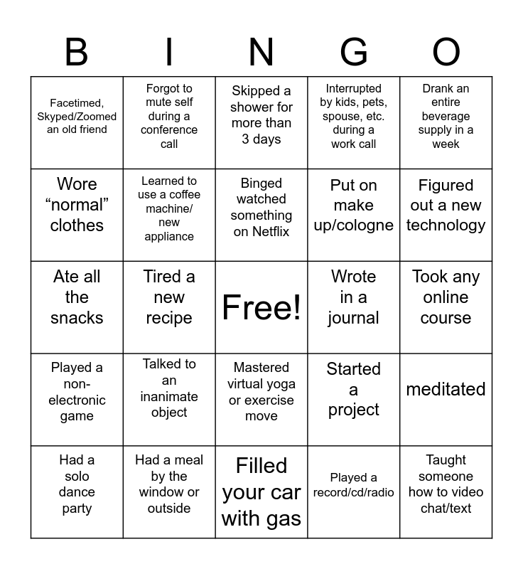 This bingo card has a free space and 24 words: Talked to an inanimate object, Had a meal by the window or outside, Binged watched something on Netflix, Had a solo dance party, Drank an entire beverage supply in a week, Facetimed, Skyped/Zoomed an old friend, Wore “normal” clothes, Forgot to mute self during a conference call, Wrote in a journal, Mastered virtual yoga or exercise move, Put on make up/cologne, Ate all the snacks, Started a project, meditated, Learned to use a coffee machine/ new appliance, Played a record/cd/radio, Took any online course, Skipped a shower for more than 3 days, Figured out a new technology, Tired a new recipe, Taught someone how to video chat/text, Played a non-electronic game, Interrupted by kids, pets, spouse, etc. during a work call and Filled your car with gas.
