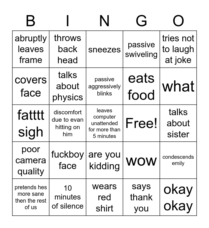 This bingo card has a free space and 24 words: fuckboy face, 10 minutes of silence, passive aggressively blinks, pretends hes more sane then the rest of us, tries not to laugh at joke, abruptly leaves frame, covers face, throws back head, Free!, are you kidding, eats food, fatttt sigh, wow, condescends emily, talks about physics, says thank you, talks about sister, sneezes, what, discomfort due to evan hitting on him, okay okay, poor camera quality, passive swiveling and wears red shirt.