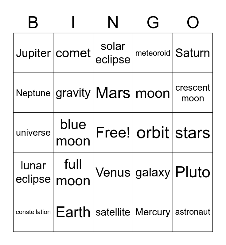 This bingo card has a free space and 26 words: Venus, Mercury, Mars, Earth, Saturn, Jupiter, Neptune, comet, stars, galaxy, moon, universe, Pluto, constellation, blue moon, asteroid, meteoroid, lunar eclipse, solar eclipse, astronaut, crescent moon, satellite, orbit, full moon, gravity and space shuttle.