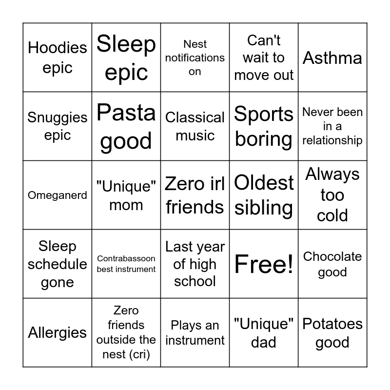 This bingo card has 25 words: Contrabassoon best instrument, Plays an instrument, Classical music, Allergies, Asthma, Hoodies epic, Snuggies epic, Sleep epic, Oldest sibling, Last year of high school, Sports boring, Omeganerd, Free!, Chocolate good, Pasta good, Potatoes good, Always too cold, Nest notifications on, Never been in a relationship, "Unique" mom, Zero irl friends, Zero friends outside the nest (cri), Sleep schedule gone, Can't wait to move out and "Unique" dad.