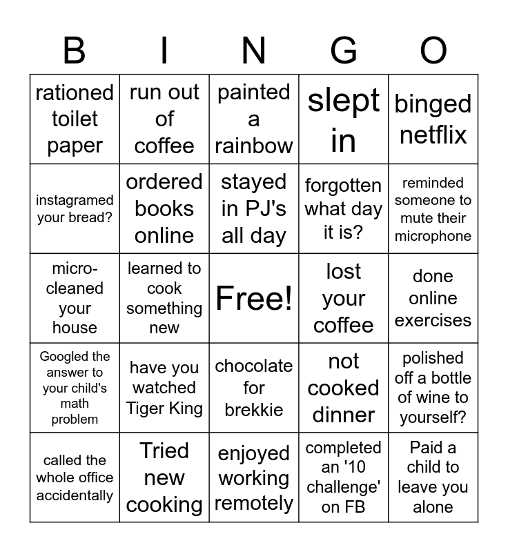 This bingo card has a free space and 24 words: have you watched Tiger King, Tried new cooking, stayed in PJ's all day, called the whole office accidentally, binged netflix, rationed toilet paper, instagramed your bread?, run out of coffee, lost your coffee, chocolate for brekkie, forgotten what day it is?, micro-cleaned your house, not cooked dinner, polished off a bottle of wine to yourself?, ordered books online, completed an '10 challenge' on FB, done online exercises, painted a rainbow, reminded someone to mute their microphone, learned to cook something new, Paid a child to leave you alone, Googled the answer to your child's math problem, slept in and enjoyed working remotely.