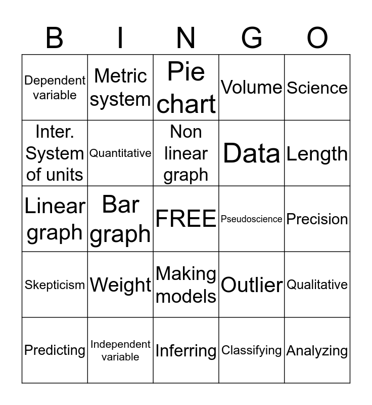 This bingo card has a free space and 24 words: Weight, Independent variable, Non linear graph, Predicting, Science, Dependent variable, Inter. System of units, Metric system, Pseudoscience, Making models, Data, Linear graph, Outlier, Qualitative, Quantitative, Classifying, Precision, Pie chart, Length, Bar graph, Analyzing, Skepticism, Volume and Inferring.