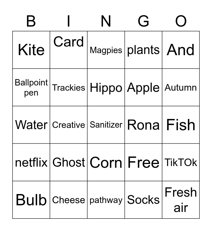 This bingo card has a free space and 24 words: Ghost, Cheese, Hippo, Bulb, And, Kite, Ballpoint pen, Card, Rona, Corn, Apple, Water, Free, TikTOk, Trackies, Socks, Fish, Magpies, Autumn, Creative, Fresh air, netflix, plants and pathway.