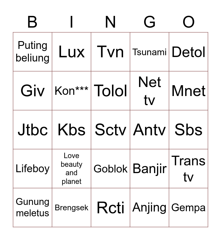 This bingo card has a free space and 24 words: Love beauty and planet, Brengsek, Tolol, Gunung meletus, Detol, Puting beliung, Giv, Lux, Antv, Goblok, Net tv, Jtbc, Banjir, Trans tv, Kon***, Anjing, Sbs, Tvn, Mnet, Kbs, Gempa, Lifeboy, Tsunami and Rcti.