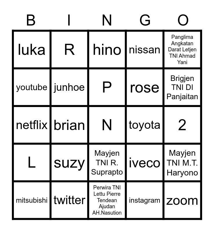 This bingo card has a free space and 24 words: suzy, twitter, P, mitsubishi, Panglima Angkatan Darat Letjen TNI Ahmad Yani, luka, youtube, R, toyota, Mayjen TNI R. Suprapto, rose, netflix, iveco, Mayjen TNI M.T. Haryono, junhoe, instagram, 2, hino, Brigjen TNI DI Panjaitan, brian, zoom, L, nissan and Perwira TNI Lettu Pierre Tendean Ajudan AH.Nasution.