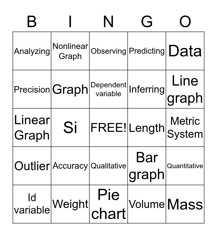 This bingo card has a free space and 24 words: Accuracy, Weight, Dependent variable, Id variable, Data, Analyzing, Precision, Nonlinear Graph, Length, Qualitative, Inferring, Linear Graph, Bar graph, Quantitative, Graph, Volume, Metric System, Observing, Line graph, Si, Mass, Outlier, Predicting and Pie chart.