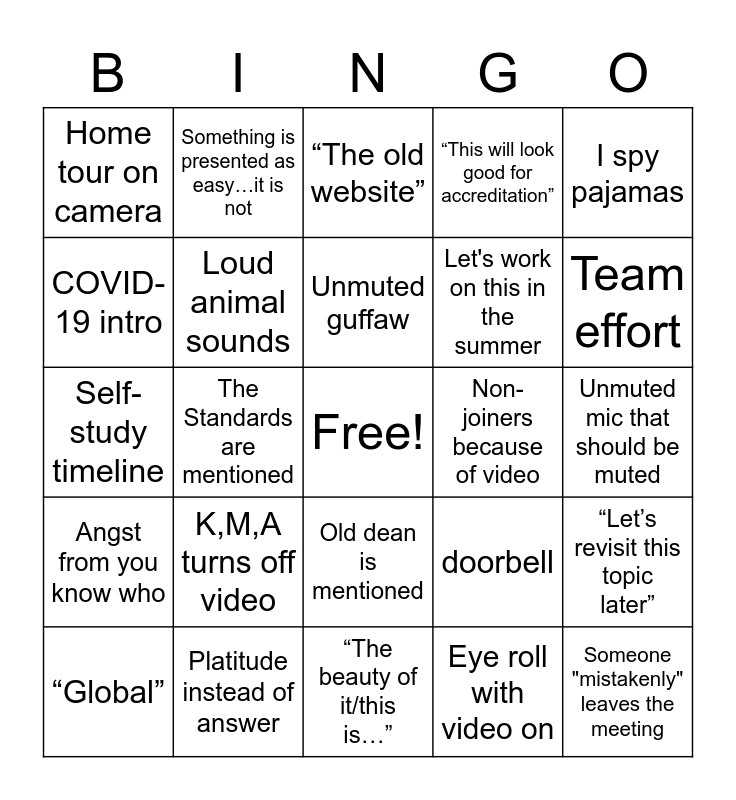 This bingo card has a free space and 24 words: “Global”, K,M,A turns off video, Unmuted guffaw, Eye roll with video on, I spy pajamas, Home tour on camera, Something is presented as easy…it is not, “The old website”, Non-joiners because of video, Unmuted mic that should be muted, Self-study timeline, Loud animal sounds, doorbell, “Let’s revisit this topic later”, COVID-19 intro, Platitude instead of answer, “The beauty of it/this is…”, “This will look good for accreditation”, Team effort, Angst from you know who, The Standards are mentioned, Old dean is mentioned, Let's work on this in the summer and Someone "mistakenly" leaves the meeting.