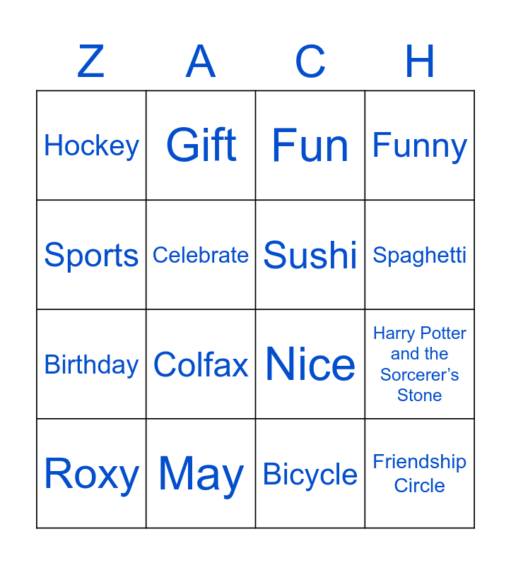 This bingo card has 27 words: Zach, Karabin, Birthday, Party, Celebrate, Fun, Gift, Friendship Circle, May, Cool, Nice, Funny, Athletic, 9, Colfax, Blue, Sushi, Spaghetti, Hamburgers, Hockey, Bicycle, The Mighty Ducks, Harry Potter and the Sorcerer’s Stone, Roxy, St. Petersburg, Russia, Sports and Special drinks.