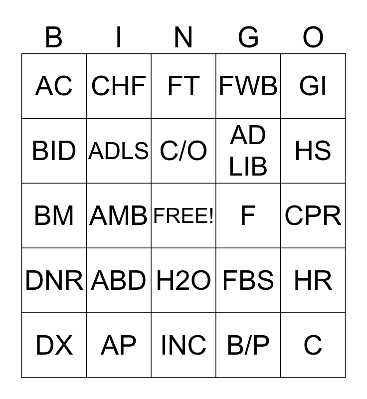 This bingo card has a free space and 24 words: ABD, AP, C/O, DX, GI, AC, BID, CHF, F, H2O, AD LIB, BM, FBS, HR, ADLS, B/P, CPR, FT, HS, AMB, C, DNR, FWB and INC.
