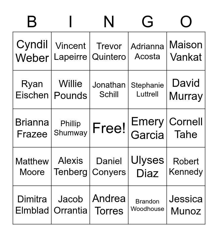 This bingo card has a free space and 170 words: Stephanie Martinez, Shadoe Farnsworth, Rebekah Smith, Cari Leigh Currie, Brianna Frazee, Tyler Samuel, Anthony Wood, Jessica Legg, Benjamin Zetina, Luis Mendoza, Rebeccah Montiel, Scott Ward, Jonathan Schill, Jordan Washburn, Jessica Munoz, Claudia Rocha, Frank Calderon, Israel Beltran, Brince Olguin Bustamante, Chinh Potter, Riley Ing, Laneice Smith, Monique Jimenez, Spring Betancourt, Daishalee Melendez, Jala Berry, Mirella Lobato, Haleigh Axelson, Gloria Williams, Hunter Nodwell, Logan Taylor, Ashley Pay, Willie Pounds, Ariell Secor, Andrea Torres, Kila Mchenry, Bridger Betz, Elizabeth Crews, Harper Greer, Kevi Jones, Kimberly Chambers, Beatriz Gonzalez, Dimitra Elmblad, Jaden Neill, Brock Johnson, Alejandro Ochoa, Alexis Evans, Morgan Allen, Phillip Shumway, Robert Neeleman, Falann Mattison, Kwame Rogers, Adrianna Acosta, Dana Axberg, Samantha Whaley, Adam Wormsbaker, Raquel Anaya, Alexis Tenberg, Thomas Segura, Selinah Castille, Emery Garcia, Jordan Ray, Sara Johnson, Jasmine Magana, Lindsay Gross, Alejandro Coronado, Terry Davenport, Jonathan Thatcher, Henry Flores, Cornell Tahe, Michael Meloni, Jacob Davidson, Matthew Dallas, Casey St James, Brandon Cuspard, Michael Smeraldo, Dustin Breese, Skyler Lobdell, Jose Gomez, Steven Bouman, Justin Wrage, Michelle Bemis, Leonard Carlson, Pamela Fabiano, Joshua Loraw, Daniel Whited, Christopher Vickery, Earl Clark, Jacob Orrantia, Matthew Perry, Sherman Jordan, Steve Bieda, James Lumsden, Charles Florence, David Murray, Vincent Lapeirre, Daniel Conyers, Gerardo Rosado, Michelle Mcmahan, Jacob Pelletier, Ulises Mejia, Scott Kadolph, Grigor Oganesyan, Michael Vonlinsowe, Robert Kennedy, Brett Brand, Wesley Hathaway, Armando Medina, Ryan Eischen, Avery Russell, Kaumaka Stark, Matthew Moore, Adam Whitlock, Trevor Quintero, Jason Stachura, Michael Sikorski, Edward Stamsek, Derek Rhode, Maison Vankat, Tyler Hamilton, Christopher Chase, Scott Hubbard, Thomas Hunter, Joshua Adams, Wayne Hutton, Joseph Daigle, Mike Boyce, Juan Valenzuela, Alejandro Hernandez, Andrew Westhoven, Daniel Dohm, Miguel Ayala, Fernando Garcia, Ulyses Diaz, Nicholas Benzo, Dana Hammerl, Mason Pipes, Joshua Hensley, Alexander Martinez, David Harrington, Ryan Smith, Brandon Woodhouse, Andre Spangler, Ashley Rose, Stephen Tutelo, Stephanie Luttrell, Tammy Anthony, Connie Finzel, Andrea Urias, Jennifer Compton, Kayla Guelian, Daja Merrill, Vanessa Pepin, Myisha Mckinley, Steven Westbrook, Jolisa Cota, Cyndil Weber, Natalie Nardone, Sarah Zaldana, Alphonso Quoziente, Joseph Pike, Michael Romero, Andrew Agredano, Matthew Christensen, Joseph Exley, Richard Freeman, Scott Pfeiffer, Stephen Patton, Scott Manis and Michael Massey.