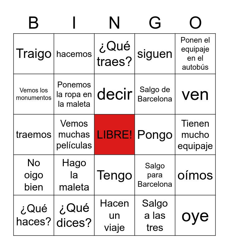 This bingo card has a free space and 29 words: ¿Qué haces?, ¿A qué hora sale el avión?, Vemos muchas películas, Digo, Traigo, ¿Qué traes?, Ponemos la ropa en la maleta, Hago la maleta, Pongo, ¿Qué dices?, Tienen mucho equipaje, oye, Hacen un viaje, Salgo a las tres, ven, Sale con el novio, Tengo, No oigo bien, Ponen el equipaje en el autobús, traemos, Salgo para Barcelona, Sigo las instrucciones, Salgo de Barcelona, Vemos los monumentos, siguen, hacemos, oímos, decir and traer.