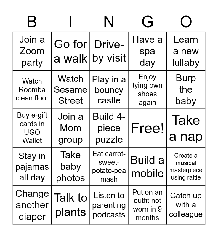 This bingo card has a free space and 24 words: Take baby photos, Talk to plants, Play in a bouncy castle, Change another diaper, Learn a new lullaby, Join a Zoom party, Watch Roomba clean floor, Go for a walk, Free!, Eat carrot-sweet-potato-pea mash, Enjoy tying own shoes again, Buy e-gift cards in UGO Wallet, Build a mobile, Create a musical masterpiece using rattle, Watch Sesame Street, Put on an outfit not worn in 9 months, Take a nap, Drive-by visit, Burp the baby, Join a Mom group, Catch up with a colleague, Stay in pajamas all day, Have a spa day and Listen to parenting podcasts.