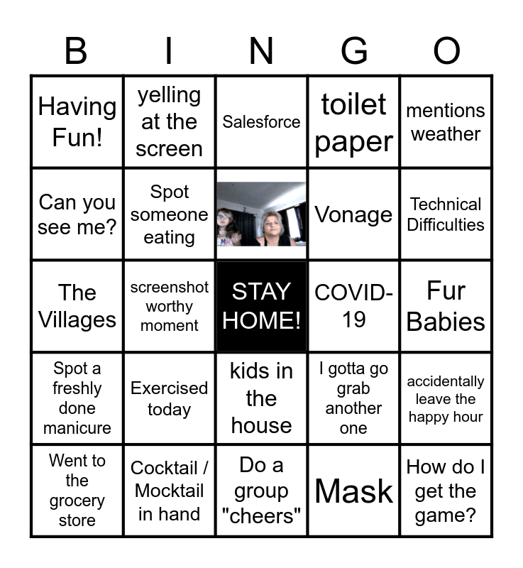 This bingo card has 3 images, a free space and 29 words: "Social Distancing", Cocktail / Mocktail in hand, Do a group "cheers", laugh out loud, Technical Difficulties, Having Fun!, screenshot worthy moment, kids in the house, toilet paper, How do I get the game?, Can you see me?, yelling at the screen, Mask, Spot a freshly done manicure, Spot a new haircut / color, COVID-19, Fur Babies, Went to the grocery store, Exercised today, Watched Netflix today, I gotta go grab another one, accidentally leave the happy hour, The Villages, Spot someone eating, Salesforce, Vonage, mentions weather, Quarantine and mention something the see in the background.