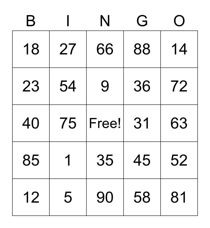 This bingo card has a free space and 24 words: 1, 5, 9, 12, 14, 18, 23, 27, 31, 35, 36, 40, 45, 52, 54, 58, 63, 66, 72, 75, 81, 85, 88 and 90.