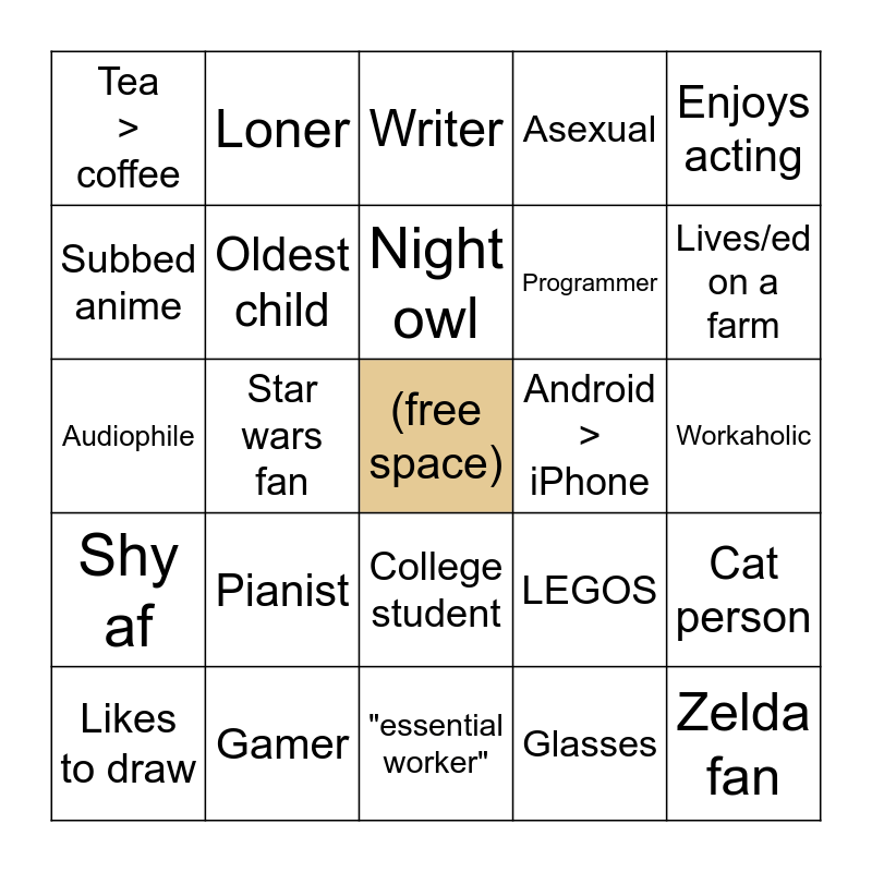 This bingo card has a free space and 24 words: Pianist, Gamer, Night owl, Likes to draw, Enjoys acting, Tea > coffee, Subbed anime, Loner, Android > iPhone, College student, Programmer, Audiophile, LEGOS, Cat person, Oldest child, Glasses, Workaholic, Writer, Lives/ed on a farm, Star wars fan, Zelda fan, Shy af, Asexual and "essential worker".