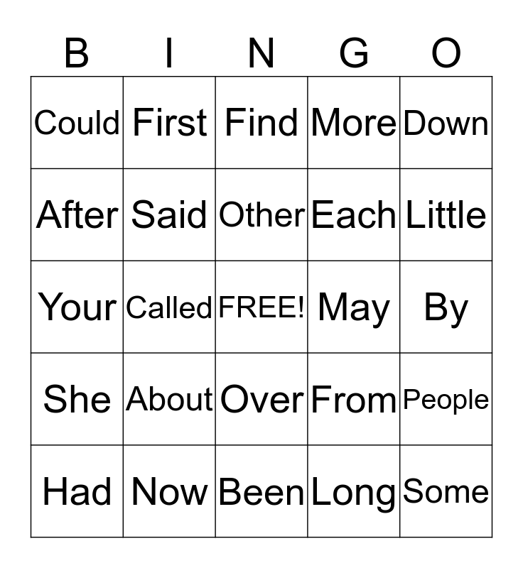 This bingo card has a free space and 24 words: About, Now, Other, Had, Down, Could, After, First, May, Over, Each, Your, From, People, Said, Long, By, Find, Little, Called, Some, She, More and Been.