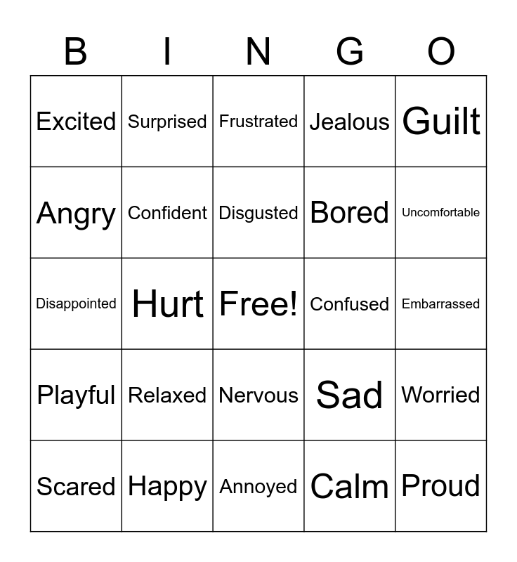 This bingo card has a free space and 24 words: Relaxed, Happy, Disgusted, Scared, Guilt, Excited, Angry, Surprised, Confused, Nervous, Bored, Disappointed, Sad, Worried, Confident, Calm, Embarrassed, Frustrated, Uncomfortable, Hurt, Proud, Playful, Jealous and Annoyed.