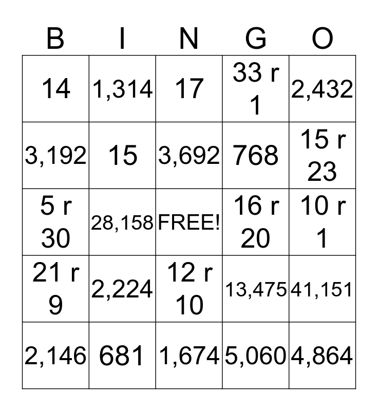 This bingo card has a free space and 24 words: 2,224, 681, 3,692, 2,146, 2,432, 14, 3,192, 1,314, 16 r 20, 12 r 10, 768, 5 r 30, 13,475, 41,151, 15, 5,060, 10 r 1, 17, 15 r 23, 28,158, 4,864, 21 r 9, 33 r 1 and 1,674.