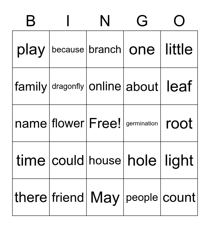 This bingo card has a free space and 24 words: could, friend, online, there, little, play, family, because, germination, house, about, name, hole, light, dragonfly, people, root, branch, leaf, flower, count, time, one and May.
