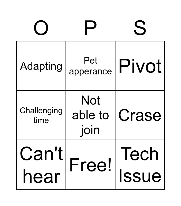 This bingo card has a free space and 8 words: Crase, Pivot, Pet apperance, Can't hear, Adapting, Tech Issue, Challenging time and Free!.