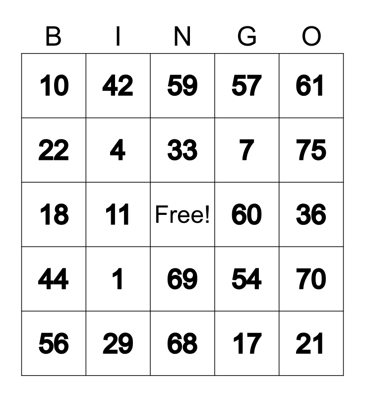 This bingo card has a free space and 24 words: 1, 29, 33, 56, 61, 10, 22, 42, 60, 69, 7, 18, 54, 70, 4, 17, 36, 59, 75, 11, 21, 44, 57 and 68.