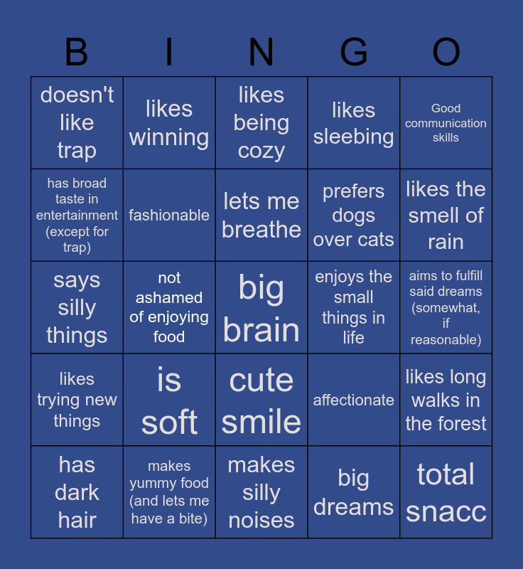 This bingo card has a free space and 24 words: is soft, makes yummy food (and lets me have a bite), lets me breathe, has dark hair, Good communication skills, doesn't like trap, has broad taste in entertainment (except for trap), likes winning, enjoys the small things in life, cute smile, prefers dogs over cats, says silly things, affectionate, likes long walks in the forest, fashionable, big dreams, aims to fulfill said dreams (somewhat, if reasonable), likes being cozy, likes the smell of rain, not ashamed of enjoying food, total snacc, likes trying new things, likes sleebing and makes silly noises.