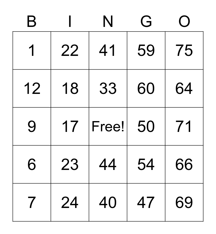 This bingo card has a free space and 24 words: 7, 23, 33, 47, 75, 1, 22, 41, 50, 71, 9, 18, 54, 66, 12, 24, 40, 59, 64, 6, 17, 44, 60 and 69.