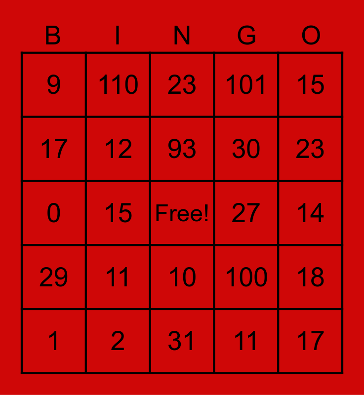 This bingo card has a free space and 29 words: 1, 7, 15, 3, 9, 23, 12, 11, 27, 2, 14, 17, 31, 11, 23, 19, 10, 29, 15, 0, 100, 25, 30, 17, 101, 110, 18, 93 and 20.