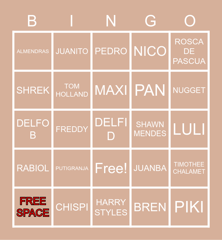 This bingo card has 26 words: Free!, BREN, MAXI, CHISPI, ROSCA DE PASCUA, ALMENDRAS, SHREK, JUANITO, LULI, JUANBA, PAN, DELFO B, TIMOTHEE CHALAMET, FREE SPACE, FREDDY, SOFIA HUGHES, NICO, RABIOL, PEDRO, DELFI D, NUGGET, HARRY STYLES, SHAWN MENDES, PUTIGRANJA, TOM HOLLAND and PIKI.