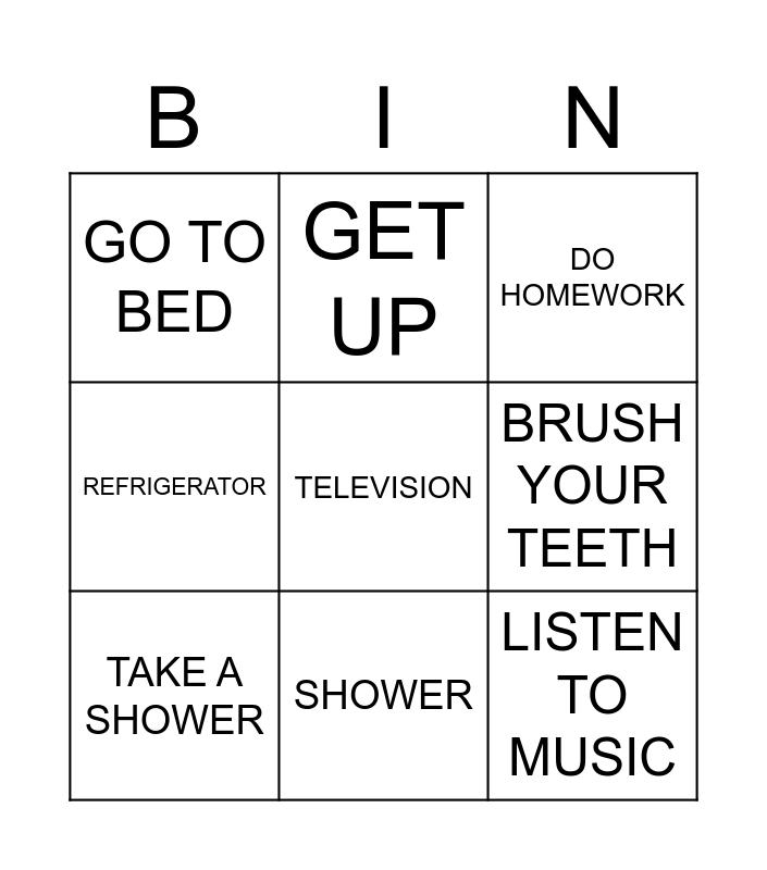 This bingo card has 22 words: Free!, WAKE UP, GET UP, EAT BREAKFAST, BRUSH YOUR TEETH, TAKE A SHOWER, GO TO BED, DO HOMEWORK, PLAY SOCCER, WATCH TV, LISTEN TO MUSIC, REFRIGERATOR, TOILET, SOFA, BED, CHAIR, WASHER, TABLE, SINK, TELEVISION, SHOWER and STOVE.