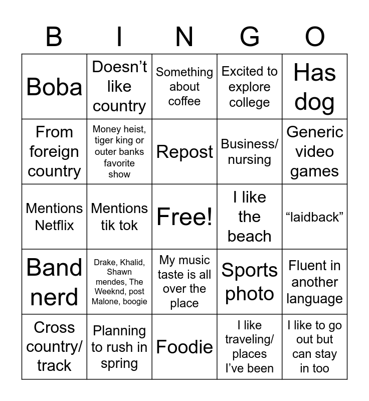 This bingo card has a free space and 51 words: I like the office, I like to go out but can stay in too, Looking for workout buddy, Foodie, Drake, Khalid, Shawn mendes, The Weeknd, post Malone, boogie, Thrifting, Doesn’t like country, Chick-fil-A, From foreign country, Joke about corona/quarantine, Money heist, tiger king or outer banks favorite show, Excited to explore college, Fluent in another language, Sports photo, Running/ hiking, Undecided, Repost, I like the beach, Snap group chat, Has dog, Mentions tik tok, I like traveling/ places I’ve been, Boba, Business/ nursing, Looking forward to meeting new people, Joke about procrastinating, Generic video games, 5 white girls in a row (?), Cross country/ track, Something about coffee, Frank Ocean, Tyler the creator, Daniel Caesar, mac Miller, Tying to find roommate, Psych major, STEM major, Honors program, Planning to rush in spring, Photography, Red bubble type merch, Feel free to reach out, Can’t wait to party, “laidback”, Band nerd, Prom/ homecoming photo, Play sport in college, Outside of major city, Cringy nickname, Mentions Netflix, Lol or haha, Study abroad, My music taste is all over the place and Outgoing.