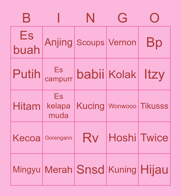 This bingo card has a free space and 24 words: Gorengann, Merah, babii, Mingyu, Bp, Es buah, Putih, Anjing, Wonwooo, Rv, Kolak, Hitam, Hoshi, Twice, Es campurr, Kuning, Tikusss, Scoups, Itzy, Es kelapa muda, Hijau, Kecoa, Vernon and Snsd.