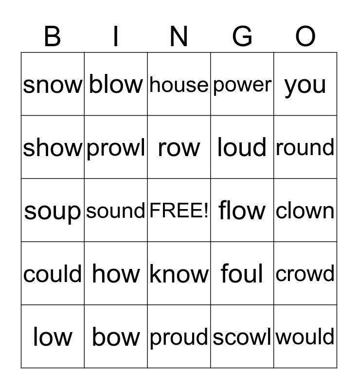 This bingo card has a free space and 24 words: how, bow, row, low, you, snow, show, blow, flow, know, loud, soup, foul, crowd, prowl, scowl, clown, house, round, sound, would, could, power and proud.