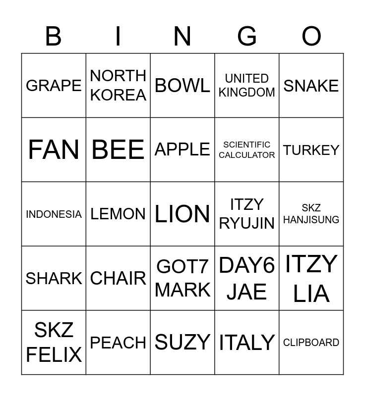 This bingo card has a free space and 24 words: SKZ FELIX, CHAIR, APPLE, ITALY, SNAKE, GRAPE, NORTH KOREA, BOWL, ITZY RYUJIN, SKZ HANJISUNG, INDONESIA, BEE, DAY6 JAE, ITZY LIA, FAN, PEACH, SUZY, UNITED KINGDOM, TURKEY, SHARK, LEMON, GOT7 MARK, SCIENTIFIC CALCULATOR and CLIPBOARD.