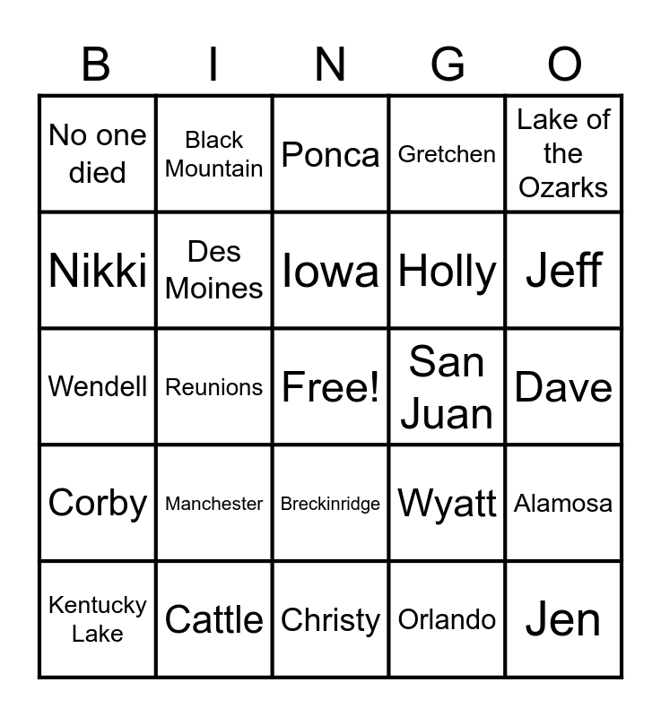 This bingo card has a free space and 62 words: CentraI City, Manchester, Louise, San Juan, Alamosa, Ryan IA, Des Moines, Elmer, Gretchen, Richard, Wendell, Virginia, Iowa, Pony, Smokie Joe, No one died, Reunions, Ponca, Wisconsin Dells, Lake of the Ozarks, Kentucky Lake, Black Mountain, Breckinridge, Orlando, Elizabeth, Jack, Charlie, Katie, Wyatt, Nick, Hannah, Bella, Ava, Michele, Dave, Nikki, Tim, Matt, Holly, Jen, Corby, Lance, Christy, Dawn, Jeff, Joy, Boogie Boogie, Farm, Auction, Meat Locker, Hogs, Cattle, Johnny & June, Ole & Lena, Jessie, Wendy, Ginger, Butcher, Major, Buddy, Miss America and Outlaws.