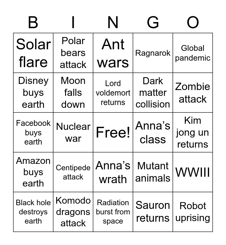 This bingo card has a free space and 55 words: Alien invasion, Black hole destroys earth, Neutron star collides with earth, Solar flare, Radiation burst from space, Astroid impact, Moon falls down, Death star, Dark matter collision, Day of judgement, Ragnarok, Zeus is angry, The sun gods are displeased, Rise of the spirits, The devil..., Some godzilla thing, Global pandemic, Nuclear war, Nuclear accident, Robot uprising, Anna’s class, Climate change, Mutant animals, Ant wars, Animal farm, Lord voldemort returns, Sauron returns, Emperor palpetine returns, Kim jong un returns, WWIII, WWIV, WWV, Steve, The prequels, Disney buys earth, Facebook buys earth, Google buys earth, Amazon buys earth, Murder hornets attack, Killer ants attack, Polar bears attack, Wasps attack, Bull atack, Terantula attack, Centipede attack, Komodo dragons attack, Dinosaurs return, Vampires emerge, Witches return, Zombie attack, Goblin invasion, Mummy’s singing, Daddy’s hair, Anna’s wrath and Calum’s litter.