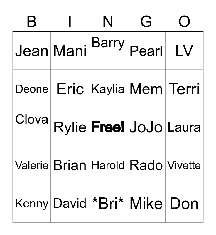 This bingo card has a free space and 53 words: Jen, Don, Erica, Mike, Brian, Yvette, Mani, Loraine, Deone, Dorett, Eric, Josie, Vivette, Rado, Roxie, Kenny, Kaylia, JoJo, James, LV, Rylie, Mina, Mem, Jean, Steph, David, Gloria, Pops, Rich, Terri, Rocky, Tiff, TQ, Preston, *Cynthia, Elaine, Pearl, *Bri*, Barry, *Audrey, *Elise, Sarah, Laura, *Sonia*, Neville, Harold, Everton, Donovan, Clova, Valerie, Carol, GB and Khalid.