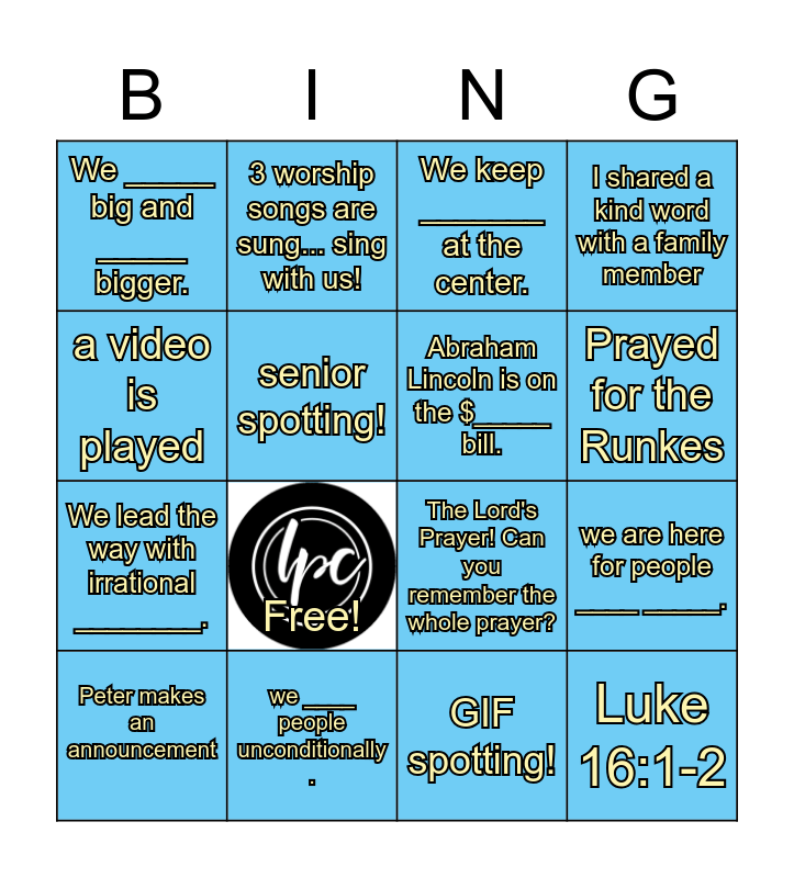 This bingo card has 1 images and 16 words: we ____ people unconditionally ., we are here for people ____ _____., We keep _______ at the center., We _____ big and _____ bigger., We lead the way with irrational ________., 3 worship songs are sung... sing with us!, The Lord's Prayer! Can you remember the whole prayer?, GIF spotting!, a video is played, senior spotting!, Peter makes an announcement, I shared a kind word with a family member, Free!, Prayed for the Runkes, Abraham Lincoln is on the $_____ bill. and Luke 16:1-2.