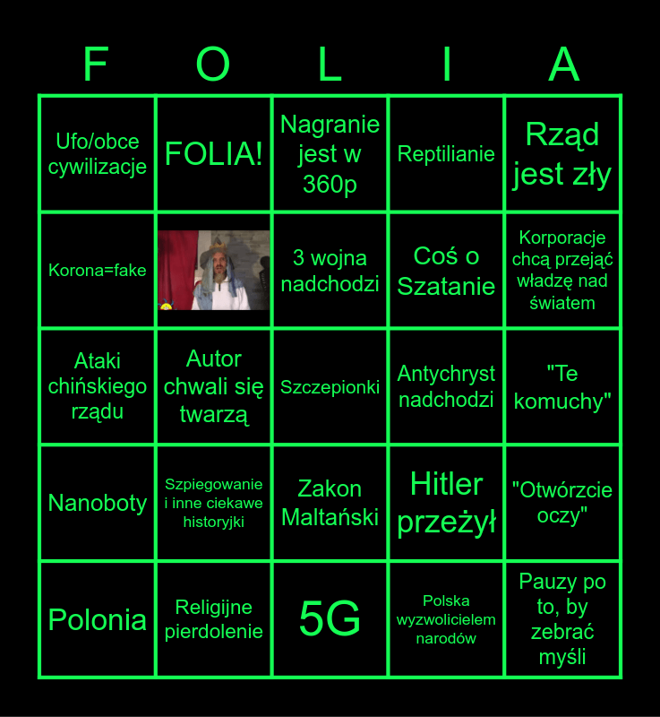 This bingo card has 2 images and 58 words: Bill Gates, Religijne pierdolenie, Big pharma, Nanoboty, Polska wyzwolicielem narodów, Masoni, Chemi Trails, Coś o Szatanie, Izrael rządzi światem, Reptilianie, Wielka Lechia, Korona=fake, Elon Musk, Zaginione cywilizacje, Ufo/obce cywilizacje, Szczepionki, Rząd jest zły, Żyjemy w Matrixie, 3 wojna nadchodzi, Antychryst nadchodzi, Nagranie jest w 360p, Polonia, "Otwórzcie oczy", Rasistowska /ksenofobiczna gadka, Tajna broń, "Mąż brata ciotki znajomej powiedział...", Depopulacja, Korporacje chcą przejąć władzę nad światem, Sekta, Kontrola innych cywilizacji, Autor sam sobie przeczy, Przedstawiciel klasy robotniczej, Coś o nazistach lub faszystach, FOLIA!, Kręcone trybem pionowym, Autor nie chwali się twarzą, Autor chwali się twarzą, Ataki chińskiego rządu, CIA, Szpiegowanie i inne ciekawe historyjki, "Te komuchy", "Ci faszyści", Hitler przeżył, Umiejętność dedukcji na poziomie Sherlocka Holmse'a, Logiczne fakty... bez logiki, "Niezaprzeczalny argument", Płaska Ziemia, Zakon Maltański, 5G, Mówca ubrany albo jak na pogrzeb, albo jak na wf, Dziwne ujęcia, Żydzi, Kręcone w samochodzie, Rewelacyjny angielski, Rosja, Ameryka, Pauzy po to, by zebrać myśli and Łamany język.