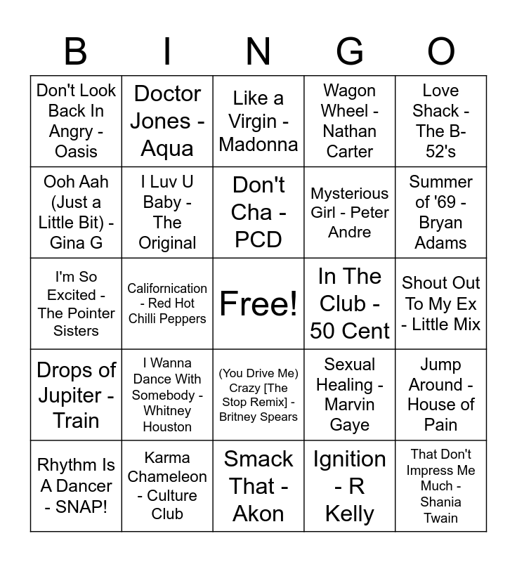 This bingo card has a free space and 25 words: I Wanna Dance With Somebody - Whitney Houston, Smack That - Akon, Don't Cha - PCD, Rhythm Is A Dancer - SNAP!, Love Shack - The B-52's, Don't Look Back In Angry - Oasis, Ooh Aah (Just a Little Bit) - Gina G, Doctor Jones - Aqua, In The Club - 50 Cent, (You Drive Me) Crazy [The Stop Remix] - Britney Spears, Mysterious Girl - Peter Andre, I'm So Excited - The Pointer Sisters, Sexual Healing - Marvin Gaye, Jump Around - House of Pain, I Luv U Baby - The Original, Fading Like A Flower - Roxette, Shout Out To My Ex - Little Mix, Like a Virgin - Madonna, Summer of '69 - Bryan Adams, Californication - Red Hot Chilli Peppers, That Don't Impress Me Much - Shania Twain, Karma Chameleon - Culture Club, Drops of Jupiter - Train, Wagon Wheel - Nathan Carter and Ignition - R Kelly.
