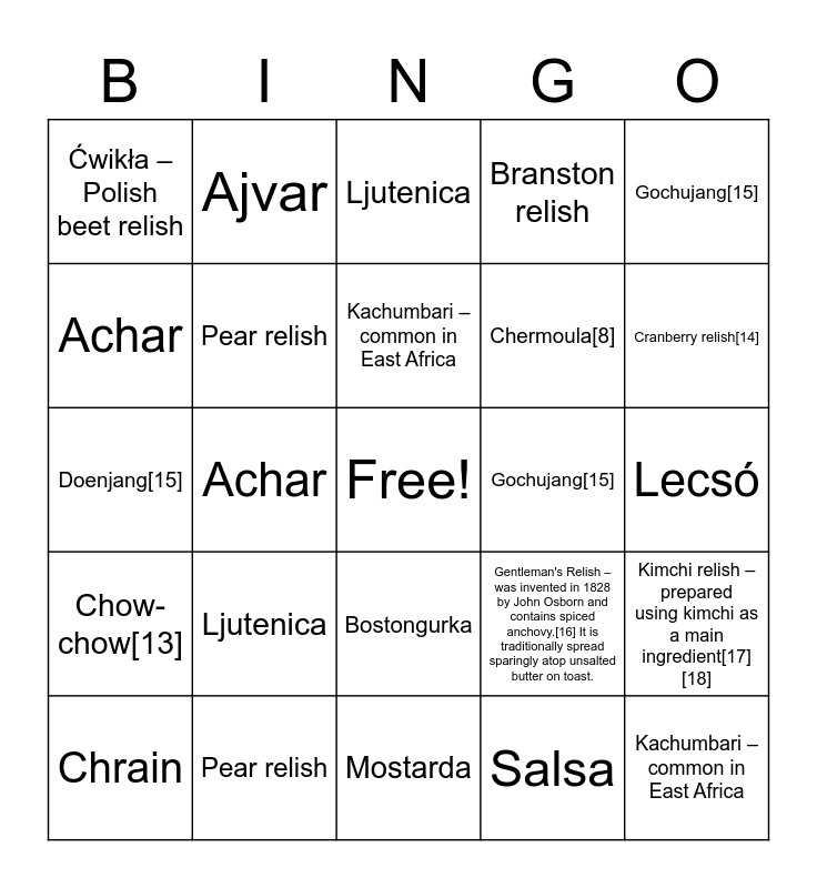 This bingo card has a free space and 72 words: Ajika, Ajvar, Achar, Atchara[11], Bostongurka, Biber salçası, Branston relish, Chakalaka[12], Chermoula[8], Chow-chow[13], Chrain, Chutney[9], Cranberry relish[14], Ćwikła – Polish beet relish, Dill relish, Doenjang[15], Gentleman's Relish – was invented in 1828 by John Osborn and contains spiced anchovy.[16] It is traditionally spread sparingly atop unsalted butter on toast., Gochujang[15], India relish[9], Lecsó, Ljutenica, Kachumbari – common in East Africa, Kimchi relish – prepared using kimchi as a main ingredient[17][18], Kyopolou, Kuchela[19], Mango pickle[20], Mixed pickles, Mostarda, Muhammara, Matbucha, Pear relish, Piccalilli, Pickled cucumber, Pinđur, Salsa, Zacuscă, Ajika, Ajvar, Achar, Atchara[11], Bostongurka, Biber salçası, Branston relish, Chakalaka[12], Chermoula[8], Chow-chow[13], Chrain, Chutney[9], Cranberry relish[14], Ćwikła – Polish beet relish, Dill relish, Doenjang[15], Gentleman's Relish – was invented in 1828 by John Osborn and contains spiced anchovy.[16] It is traditionally spread sparingly atop unsalted butter on toast., Gochujang[15], India relish[9], Lecsó, Ljutenica, Kachumbari – common in East Africa, Kimchi relish – prepared using kimchi as a main ingredient[17][18], Kyopolou, Kuchela[19], Mango pickle[20], Mixed pickles, Mostarda, Muhammara, Matbucha, Pear relish, Piccalilli[22][23], Pickled cucumber, Pinđur, Salsa[24] and Zacuscă.